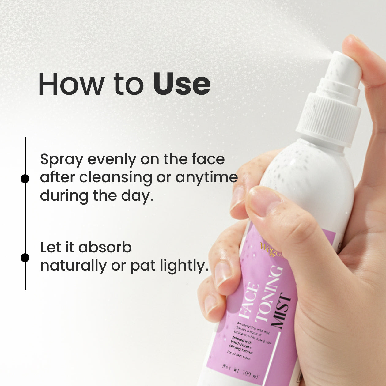 2️⃣ Spray – Hold the mist bottle 6–8 inches away and spray evenly on the face & neck.