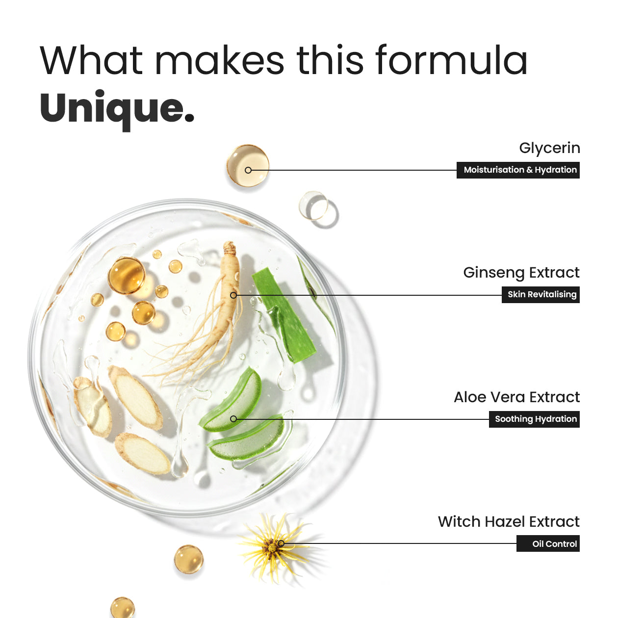 🌿 Witch Hazel Extract – Tightens pores, controls excess oil & soothes skin